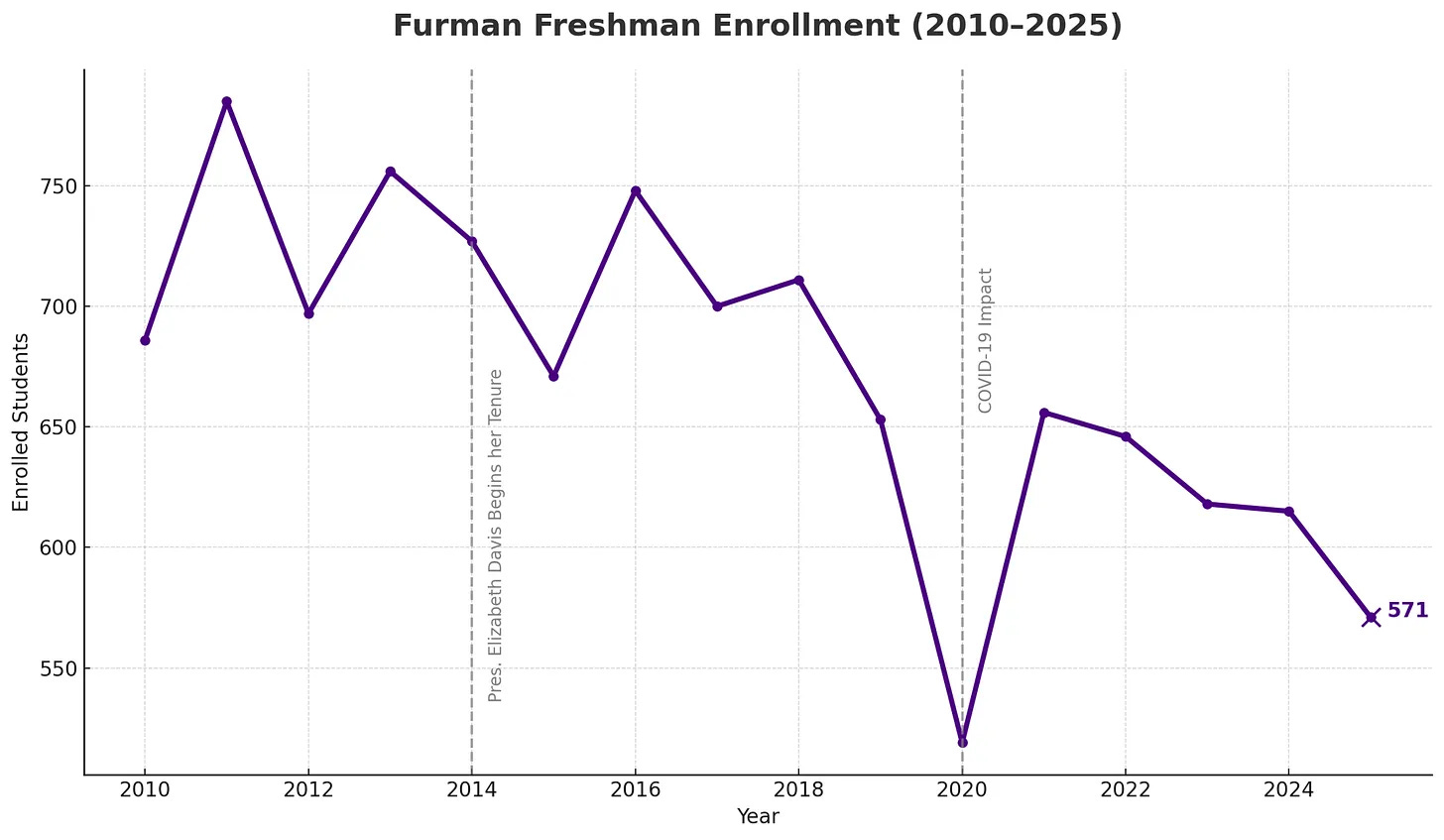 Last year, Fitch Ratings revised Furman’s credit outlook from stable to negative, citing concerns about the university’s increasingly vulnerable enrollment profile. Simply put, creditors are worried Furman is not enrolling enough students to remain financially secure.
