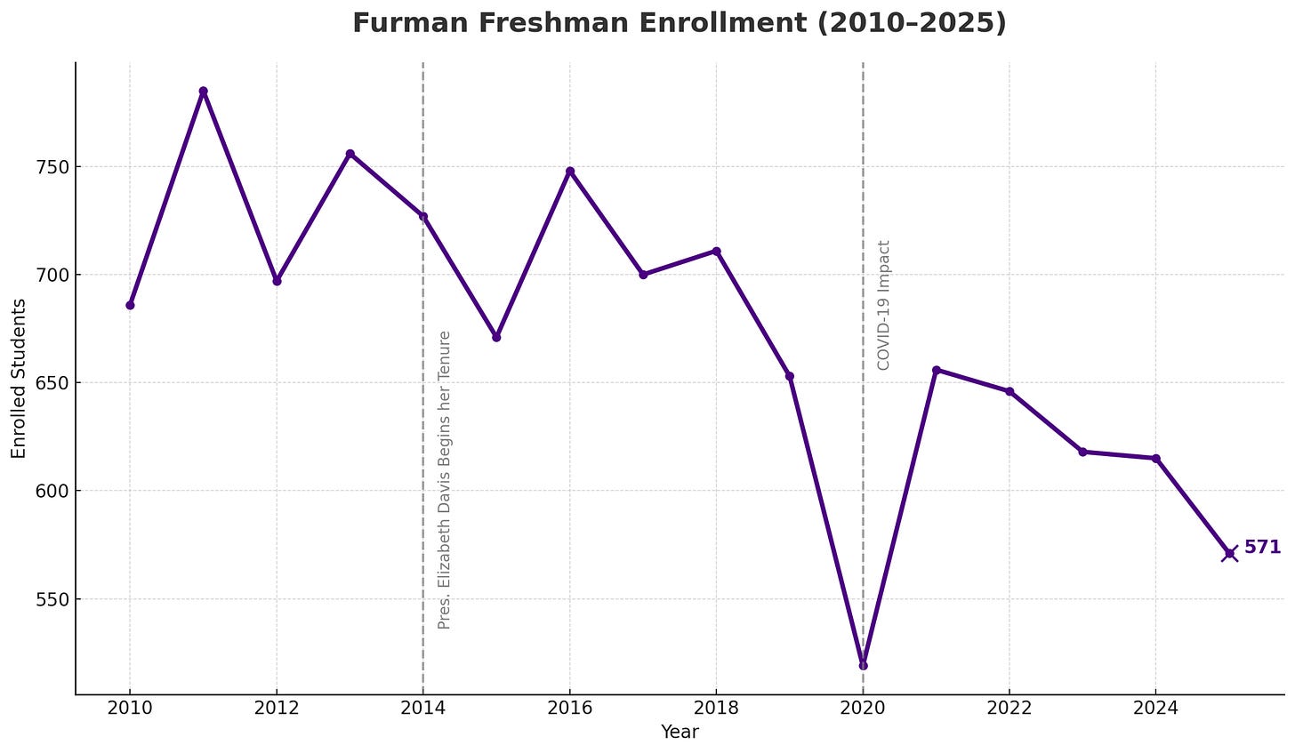 To support this claim, Fitch cites the fact that this incoming class of Paladins is small, writing that “undergraduate student deposits of 571 in April 2025” were “slightly below the 621 level in the prior year.” And a quick reference to Furman’s common data sets shows that this diminishment in the size of the incoming freshman class is part of a broader trend. The number of freshmen enrolling each fall has dropped consistently since President Elizabeth Davis took over in 2014: