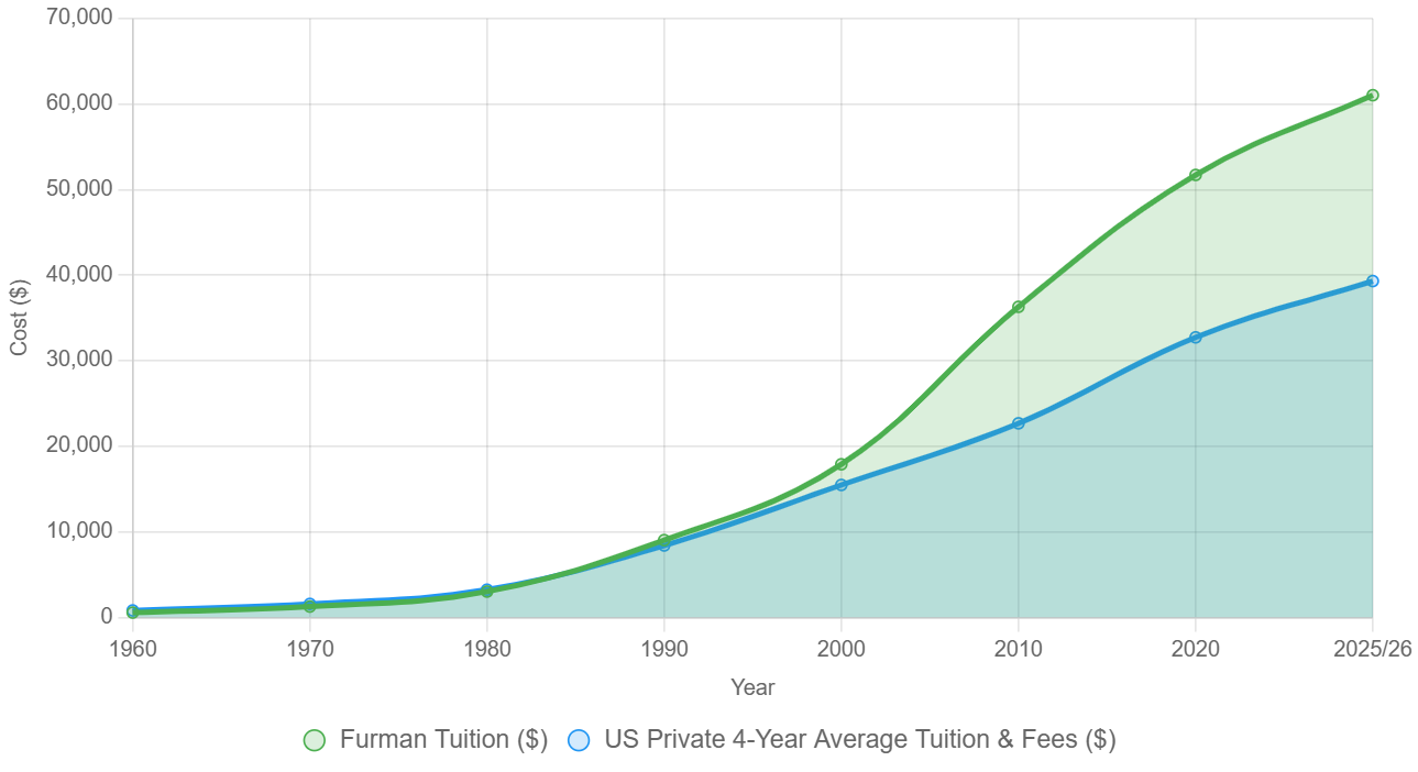 Furman’s tuition cost $550 per year in 1960. It was $1,256 in 1970. In 1980, it ran you $3,008. By 1990, it reached $9,024. It had increased to $17,888 by 2000. In 2010 it came out to $36,296. And by 2020 it hit $51,712. Today, it is $61,034.